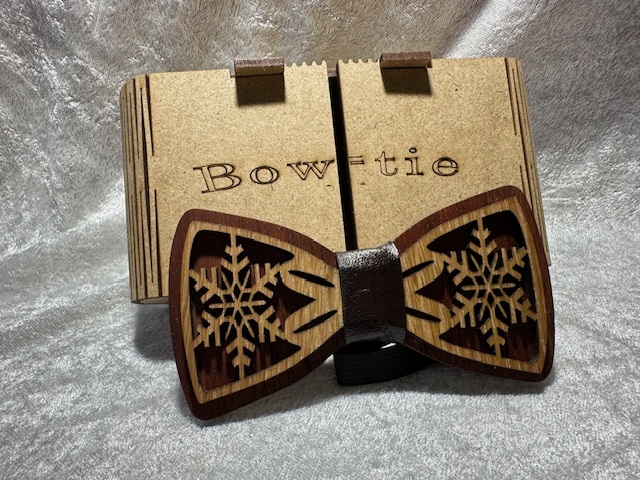 Tvers over sløyfe i tre - laget i eik med meranti som bakgrunn. Leveres i eske av mdf. Festes enkelt med strikk som har påmontert hurtigklips.